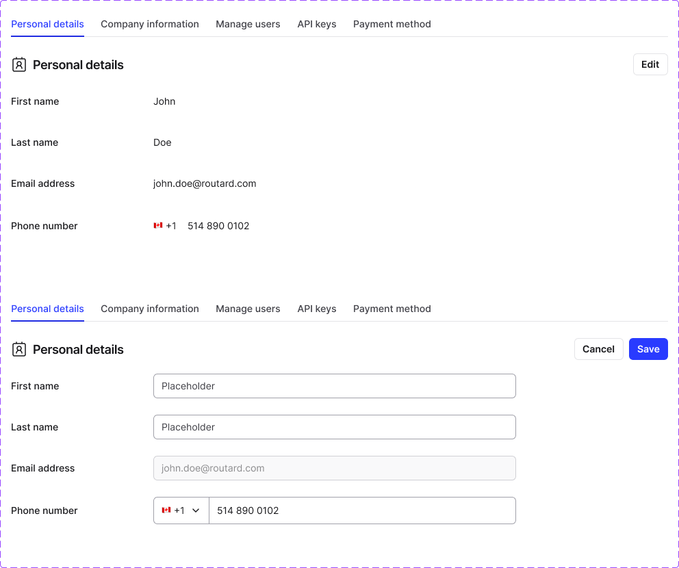A settings hub for profile, company info, users, API keys, and payout setup—built with explicit edit modes, safe confirmations, and light/dark parity.