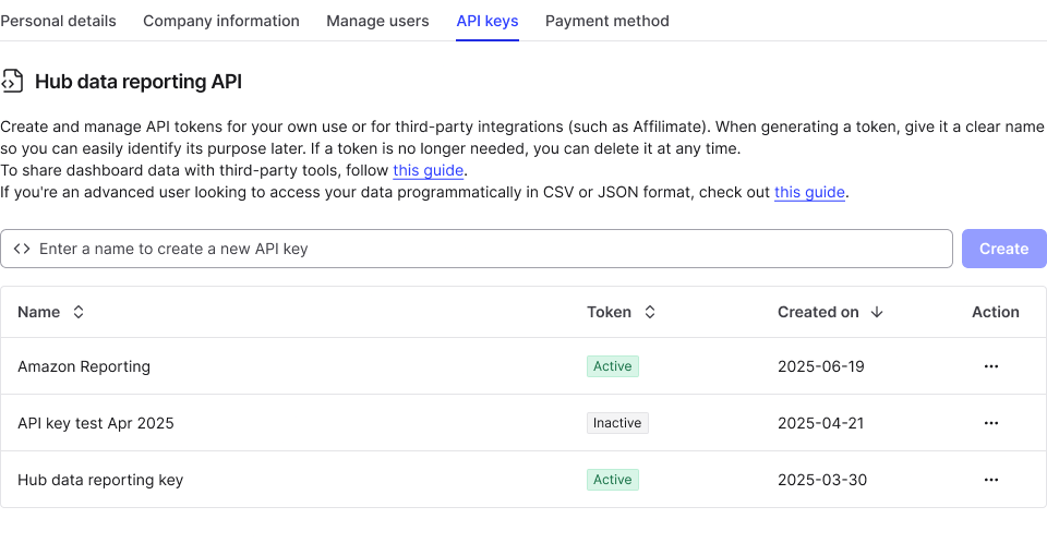 API key list and actions.